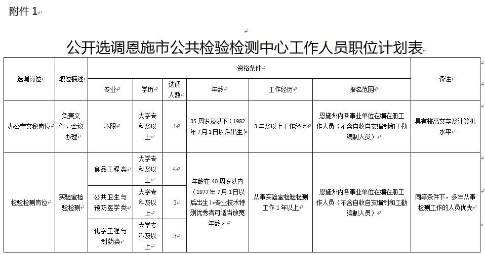 根据恩施市机构编制委员会《关于组建恩施市公共检验检测中心的通知》(恩市机编发〔2015〕27号)和恩施市机构编制委员会办公室《关于市公共检验检测中心使用编制的通知》要求,恩施市人力资源和社会保障局拟从全州事业单位在编在册人员中为恩施市公共检验检测中心公开选调11名事业编制工作人员。现将有关事宜公告如下: