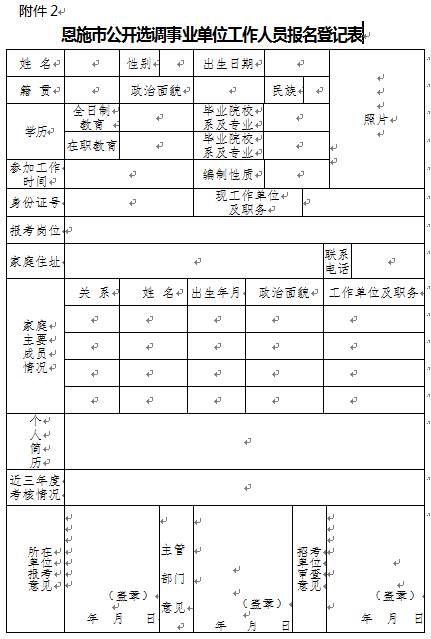 报名者携带《恩施市公开选调事业单位工作人员报名登记表》(附件2)(需所在单位及其主管部门同意并盖章)、本人身份证、学历证书原件和复印件、近三年年度考核等次证明、2张近期1寸免冠彩色照片到恩施市人力资源和社会保障局502室进行现场报名。